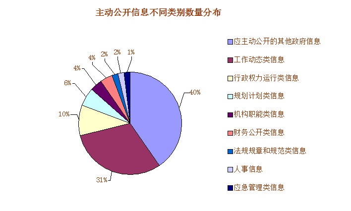 在主动公开的政府信息中,应主动公开的其他政府信息21条,占40.4%;工作动态类信息16条,占30.8%;行政权力运行类信息5条,占9.6%;规划计划类信息3条,占5.8%;机构职能类信息2条,占3.8%;财务公开类信息2条,占3.8%;法规规章和规范类信息1条,占1.9%;人事信息类信息1条,占1.9%;应急管理类信息1条,占1.9%。